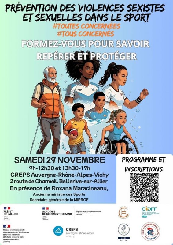 Le CREPS de Vichy, la Délégation aux droits des femmes et à l'égalité, le SDJES, le CDOS de l'Allier et un collectif d'associations, en partenariat avec la Miprof, lancent une action de sensibilisation et de formation à la prévention et à la lutte contre les violences sexistes et sexuelles dans le milieu sportif.